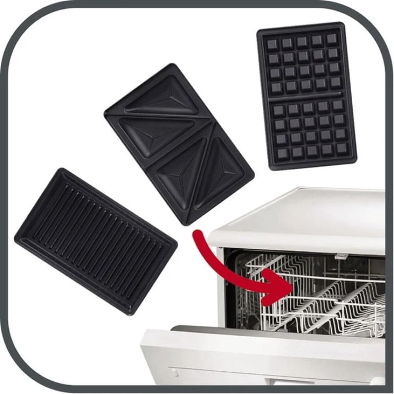 Ar Snack time, izbaudiet gan saldas, gan svinīgas uzkodas jebkurā laikā, kad sagribas! Apvienojot vafeļu un trijstūrveida sendviču gatavošanas ierīces, šis produkts uzkodas padara par baudu. Aprīkots ar izolētu rokturi un slēgu, kā arī plāksnēm ar petpiedeguma, trauku mazgājamā mašīnā mazgājamu pārklājumu, tas ir gan droši lietojams, gan viegli kopjams.