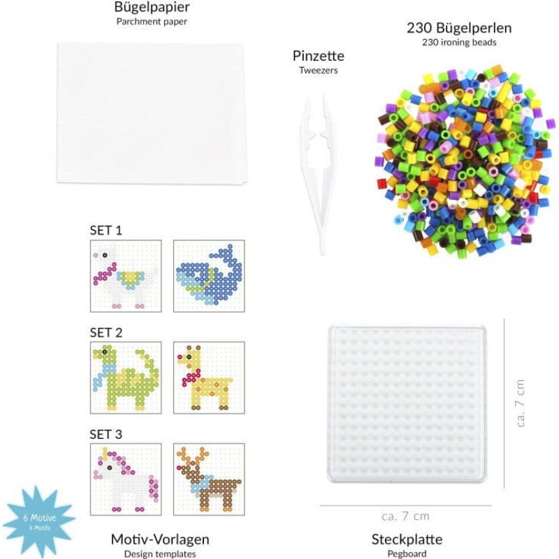 Vaikas išdėlioja spalvotus karoliukus ant specialių šablonų, juos reikia uždengti rinkinyje esančiu popieriumi ir pakaitinti lygintuvu. Fiksuotais karoliukais galima papuošti kambarį, kurti paveikslus arba pasigaminti raktų pakabuką. Rinkinį sudaro spalvoti karoliukai ir specialus pagrindas raštui sudėlioti, šablonas, pincetas ir lyginimo popierius. Iš vienos pakuotės galima pagaminti 2 figūrėles. Rekomenduojamas amžius: nuo 3 metų. Dėmesio! Netinka vaikams iki 3 metų, dėl smulkių detalių yra pavojus užspringti. Kilmės šalis: K.L.R.