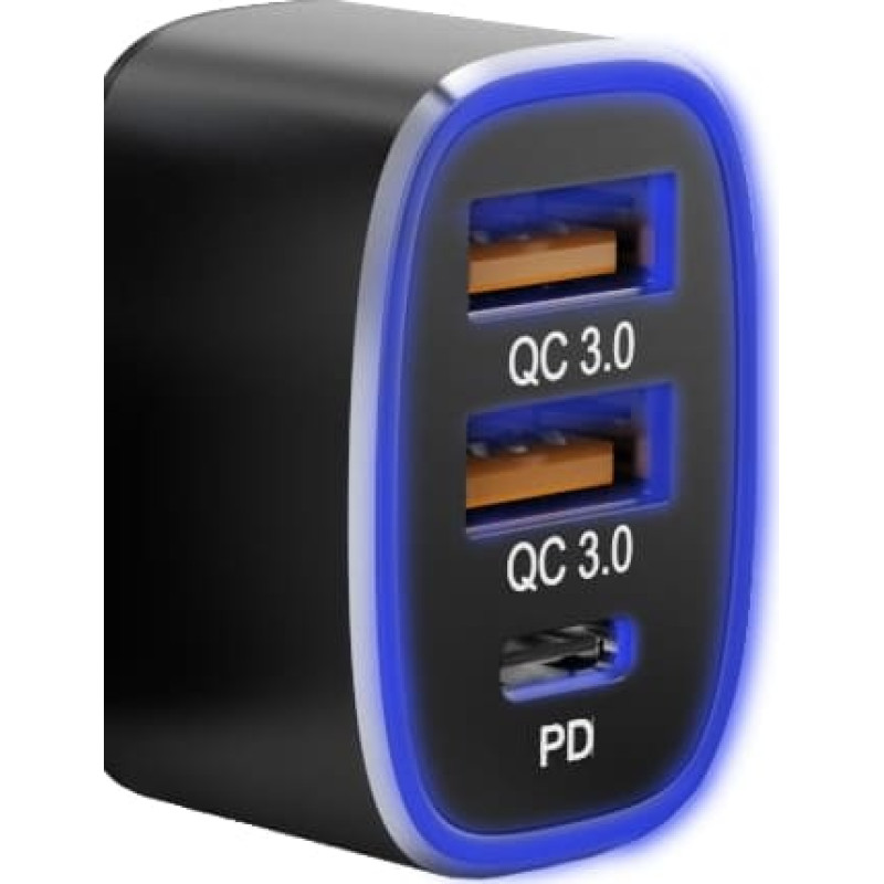 funkcijos Greitai įkrauna tris įrenginius vienu metu per PD USB-C ir QC3.0 prievadus 4 kartus greitesnis įkrovimas nei įprastas įkrovimas per PD USB-C 20 W prievadą Apvalus LED apšvietimas ir apšviesti prievadai palengvina įkroviklio naudojimą silpnai apšviestoje aplinkoje Integruota apsauga nuo viršsrovių, trumpojo jungimo, viršįtampio ir perkaitimo   Techniniai duomenys Įėjimas: DC 12-24V Bendra išvestis: 9A Bendra galia: 56W USB 1 išvestis (QC 3.0): 5 V / 3 A, 9 V / 2 A, 12 V / 1,5 A (maks. 18 W) USB 2 išvestis (QC 3.0): 5 V / 3 A, 9 V / 2 A, 12 V / 1,5 A (maks. 18 W) USB-C (PD) išvestis: 5 V3A, 9 V / 2,22 A, 12 V / 1,67 A (maks. 20 W) Apsaugos priemonės: trumpasis jungimas, viršsrovė, viršįtampa ir perkaitimas Dydis: 62×36×25 mm Svoris: 36g Medžiaga: PC + aliuminis