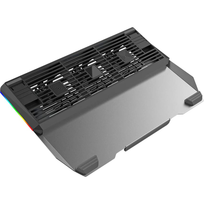 Suderinamumas: Nešiojamieji kompiuteriai Maksimalus nešiojamojo kompiuterio dydis: 17,3 colio Reguliuojama padėtis: Taip, 3 padėtys Sirgalių skaičius: 3 Ventiliatorių matmenys: 100 x 100 x 20 mm Ventiliatoriaus greitis: 1500 aps./min Greičio reguliavimas: Taip, 3 žingsniai Apšvietimas: Taip, RGB šviesa, 5 režimai Triukšmo lygis: 32dBA Oro srautas: 72CFM Jungtis: 1 x USB-A + 1 x USB-C Įtampa: DC 5V Medžiaga: aliuminio lydinys + ABS Gaminio matmenys: 393 x 267 x 36mm Produkto svoris: 590g   Į komplektaciją įeina: 1 x nešiojamojo kompiuterio aušintuvas Tellur Shade, 1 x USB-A į USB-A laidas (60 cm), 1 x vartotojo vadovas