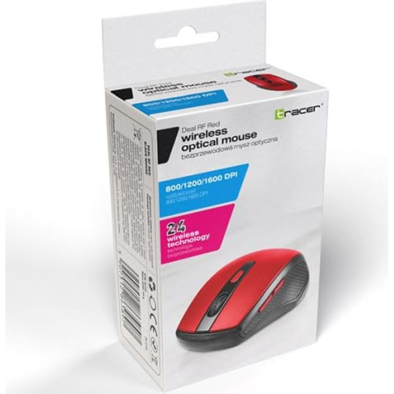 Tracer Deal RF NANO USB mobilioji pelė Raudona   apibūdinimas Susipažinkite su mobiliąja pele „Tracer Deal“, kuri yra puikus pasirinkimas kasdieniams iššūkiams. Jis siūlo patikimą 2,4 GHz belaidį ryšį be trukdžių ar vėlavimo. Mažas belaidis imtuvas užtikrina ryšį, kuriuo visada galite pasikliauti.   Optinis jutiklis. 2,4 GHz belaidis ryšys. Ergonomiškas dizainas. Puikiai tinka dešiniarankiams vartotojams.   Techniniai duomenys Mygtukų skaičius: 6 Garantija (mėnesiai): 24 VKI / DPI skyra: 800–1200–1600 Jutiklis: optinis Technologija: 2,4 GHz Maks. diapazonas (m): 10 DPI jungiklis: Taip Didžiausia skiriamoji geba dpi: 1600 Ergonomiškos formos faktorius: dešiniarankis Nano imtuvas: Taip
