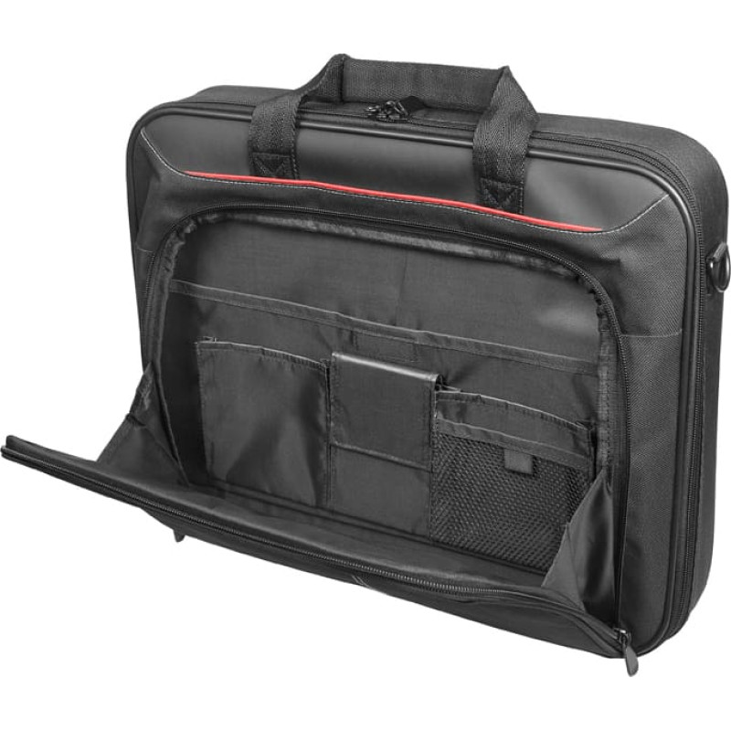 funkcijos Paprastas ir plonas dizainas Priekinė papildoma kišenė daugiau priedų Sutvarkyta priekinė kišenė su užtrauktuku Paminkštintas nešiojamojo kompiuterio skyrius Reguliuojamas ir nuimamas pečių dirželis Sustiprintos šoninės sienelės Bagažo dirželis leidžia kelioninį nešiojamojo kompiuterio krepšį tilpti ant bagažo / lagamino, perstumti ant bagažo vertikalios rankenos, kad būtų lengviau nešiotis   Techniniai duomenys Maksimalus ekrano dydžio suderinamumas: 39,6 cm (15,6 colio) Korpuso tipas: Portfelis Spalva: juoda Medžiaga: poliesteris Užsegimo tipai: užtrauktukas Darbas su: Užrašų knygelė