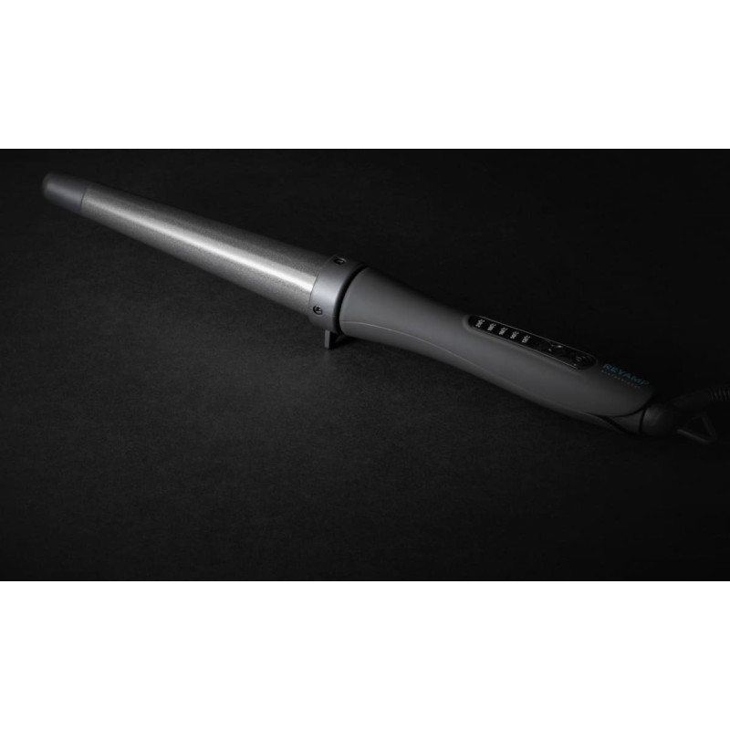funkcijos Karšta keraminė lazdelė: smailėjanti – 32 mm > 19 mm – lengvai sukurkite laisvas garbanas ir bangas 5 iš anksto nustatytos skaitmeninės temperatūros 120ºC – 210ºC – paruošta formuoti per kelias sekundes Visiškai keraminė ir joninė statinės lazdelė - Progloss eterinis aliejus su keratinu, arganu ir kokosu Itin greitas Pro PTC šildytuvas – itin greitam įkaitinimui ir šilumos atgavimui Gumuotas matinės juodos spalvos korpusas 60 minučių saugos išjungimas 3m salono klasės kabelis Apima karščiui atsparią pirštinę Tinka naudoti tik sausiems plaukams Svoris - 208g