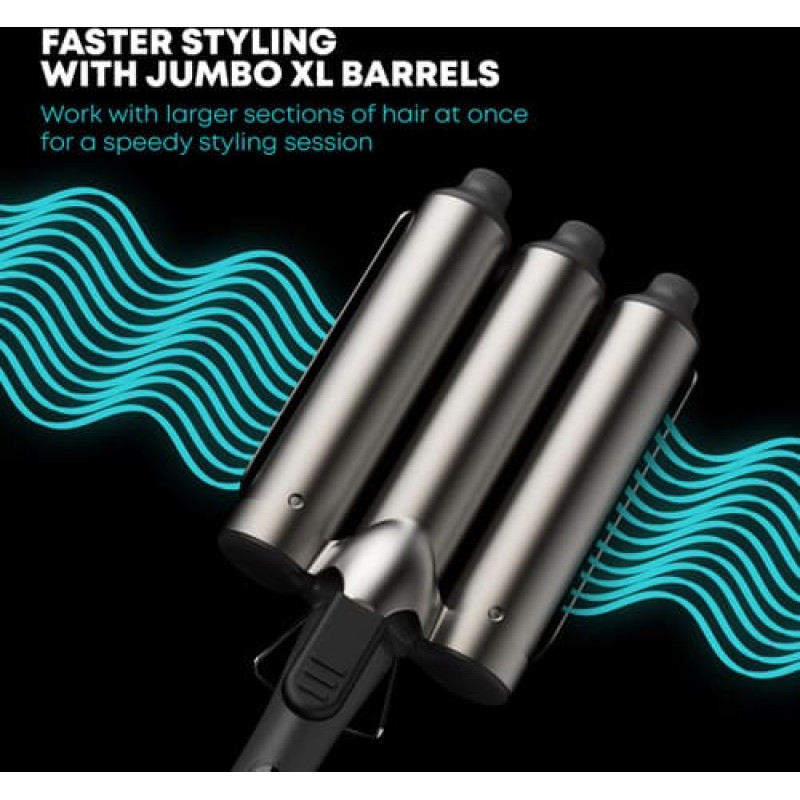 funkcijos Keraminė banglentė su XL 38 mm trijų bangų cilindrais, skirta formuoti didesnes, storesnes plaukų dalis Lygi apdaila, skirta tekančiosioms bangoms nesiglamžyti Itin greitas pro PTC šildytuvas užtikrina greitą įkaitinimą ir regeneraciją Greiti, skaitmeniniai kintami šilumos nustatymai nuo 120°C iki 210°C (tinka visų tipų plaukams) Keraminės ir joninės statinės su Progloss™ itin švelniu keratinu, argano ir kokosų aliejais Automatinis išsijungimas po 60 minučių Įmontuotas gaminių stovas Karščiui atspari pirštinė Tinka naudoti tik sausiems plaukams 3m salono pasukamas kabelis