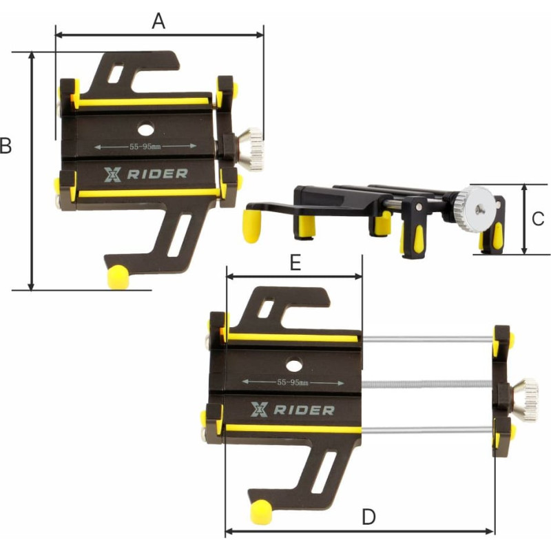 Naudojimas: motoroleris, dviratis, mopedas, keturratis, variklis Telefono atstumas (plotis): 55 - 95mm Vairo skersmuo: 22,2 - 31,8 mm Aukštis: 10,3 cm Gylis: 2,3 cm Plotis pasukus išorę (cm): 11,5 cm Vidinis plotis atsukus (cm): 9,5 cm Plotis po vidinio sukimo (cm): 5,5 cm Svoris (kg): 0,2kg Konstrukcijos medžiaga: aliuminis, silikonas Montavimo vieta: prie vairo Surinkimo būdas: vertikaliai ir horizontaliai Apsauginės guminės juostos: Taip Atsparus vandeniui: Taip