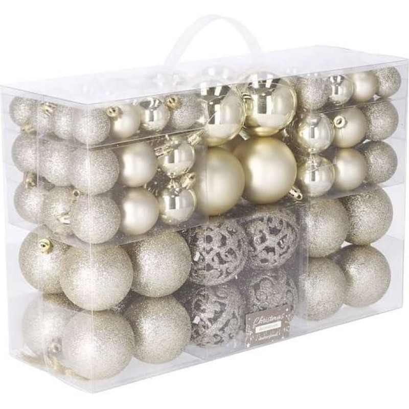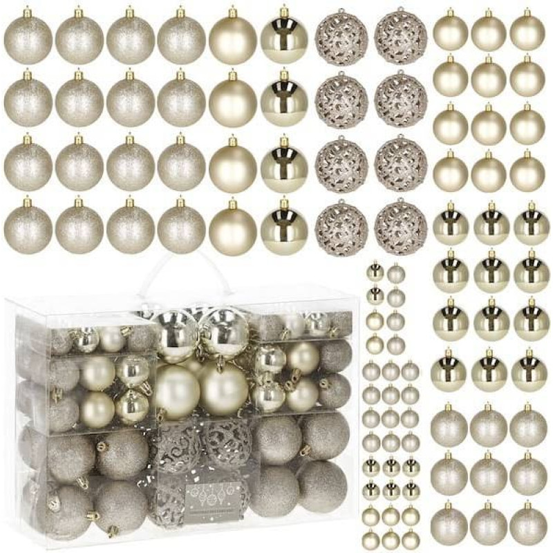 Parametrai: Prekinis ženklas: Springos Spalva: auksinė Medžiaga: plastikas Kiekis: 100 vnt Raštai: 4 skirtingi raštai Privalumai: nedūžtančios, NEMOKAMAI pakabinamos virvelės Į rinkinį įeina šie baubliai: 16x apvalus didelis (blizgučiai) – 6 cm 4x apvalus didelis (perlas) – 6 cm 4x apvalus didelis (matinis) – 6 cm 8x apvalus didelis (auksinis, ažūrinis) – 6 cm 12x apvalios vidutinės (blizgučiai) – 4 cm 12x apvali vidutinė (perlas) – 4 cm 12x apvalus vidutinis (matinis) – 4 cm 16x apvalus mažas (blizgučiai) – 3 cm 8x apvalus mažas (perlas) – 3 cm 8x apvalus mažas (matinis) – 3 cm