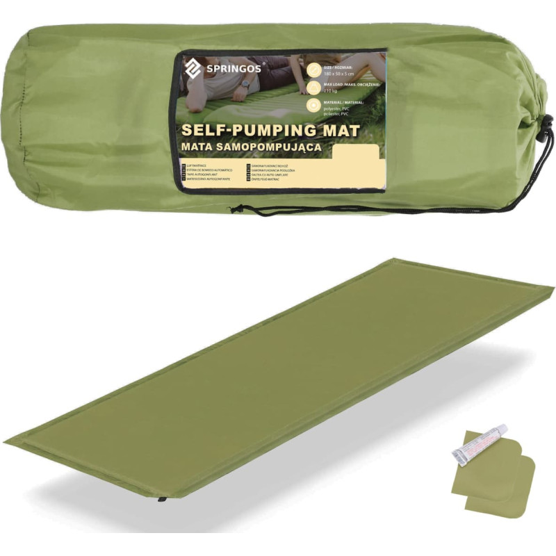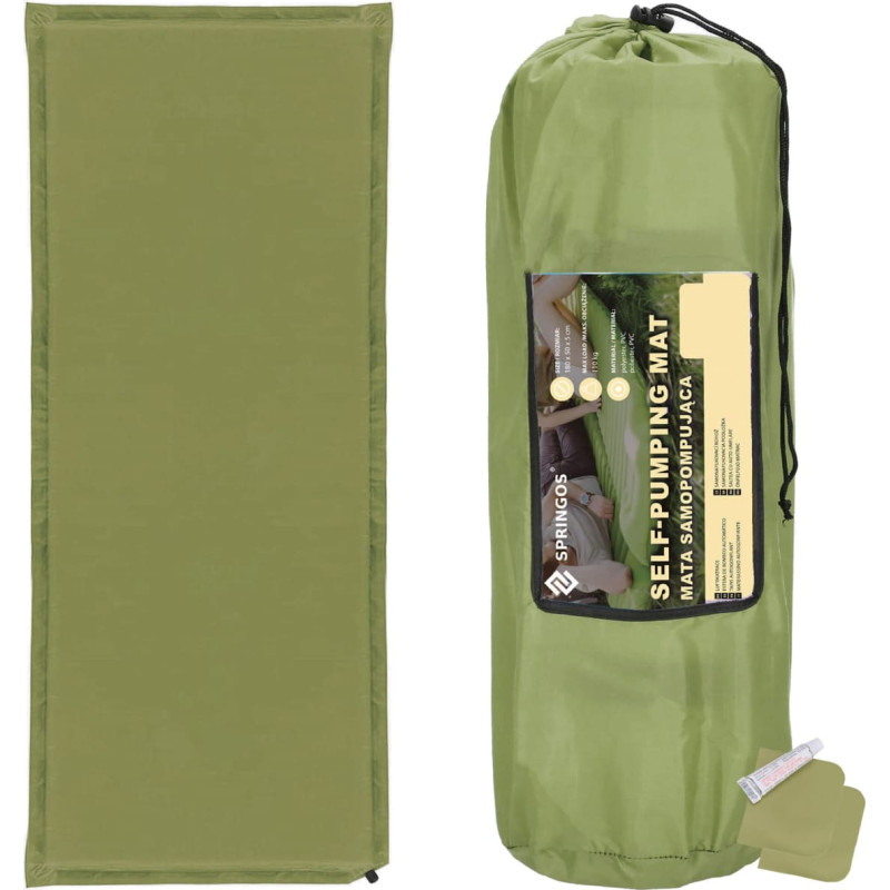 Springos Savaime prisipučiantis turistinis kilimėlis Springos PM046, 180 cm, su dėklu, žalias