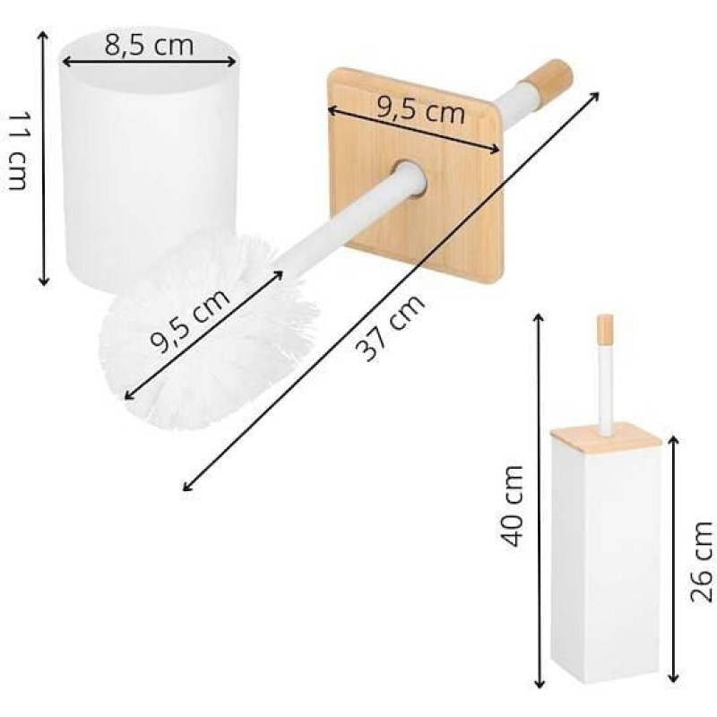 Parametrai: Prekinis ženklas: Springos® Medžiaga: metalas, bambukas Spalva: balta, ruda Tipas: tualeto šepetys Matmenys: Visas aukštis: 40 cm Pačios baltos talpos aukštis: 26 cm Visas ilgis: 9 cm Visas plotis: 9 cm Bambukinio užvalkalo matmenys: 9,5 x 9,5 x 0,5 cm Šepečio ilgis: 37 cm Šepečio storis: 1,3 / 1,7 cm Valymo dalies matmenys: 9,5 x 7,5 cm (I x G) Vidinis šepetėlio konteineris: 11 x 8,5 cm (aukštis x skersmuo)