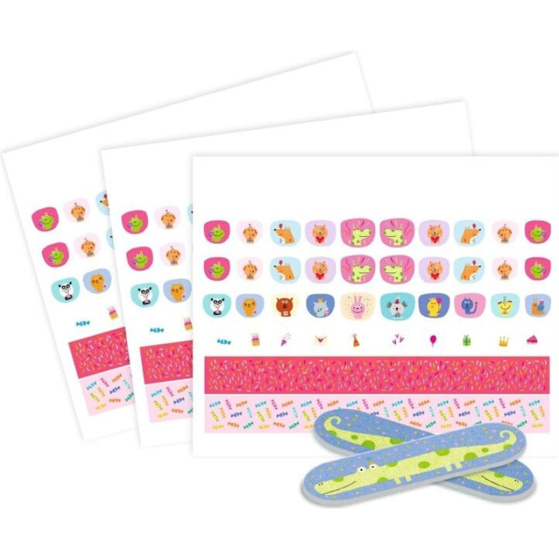 Greitas manikiūras be nagų lako vaikams, kurį lengva užsidėti ir nuimti! Tiesiog priklijuokite, paspauskite ir baigta! Norėdami pakeisti raštus arba sukurti savo lipduką, iškirpkite lipnios juostelės nago dydžio gabalėlį. Rinkinyje: 90  lipdukų nagams, 30 mažesnių lipdukų, 2 spalvingos lipnios juostelės, kurias reikia iškirpti ir 2 nagų dildės. Lipdukai atsparūs vandeniui. Rekomenduojamas amžius: nuo 4 metų. Dėmesio! Netinka vaikams iki 3 metų, dėl smulkių detalių yra pavojus užspringti. Kilmės šalis: K.L.R.