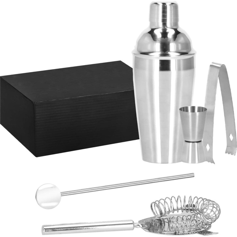Gamintojas: Springos Medžiaga: Nerūdijantis plienas Spalva: sidabras Elementų skaičius: 5 Purtyklės tūris: 550 ml (3 vnt.) Patvirtintas sąlyčiui su maistu Medžiaga: nerūdijantis plienas Spalva: sidabras Elementų skaičius: 5 Pakuotės matmenys: 13 x 9 x 20cm Trijų dalių kratytuvas - aukštis: 21 cm Filtro strypas - aukštis: 17 cm, plotis: 9 cm Matavimo puodelis - aukštis: 6,5 cm, skersmuo: 4 cm Šiaudai ir šaukštas - 18 cm Ledo žnyplės - ilgis: 17 cm