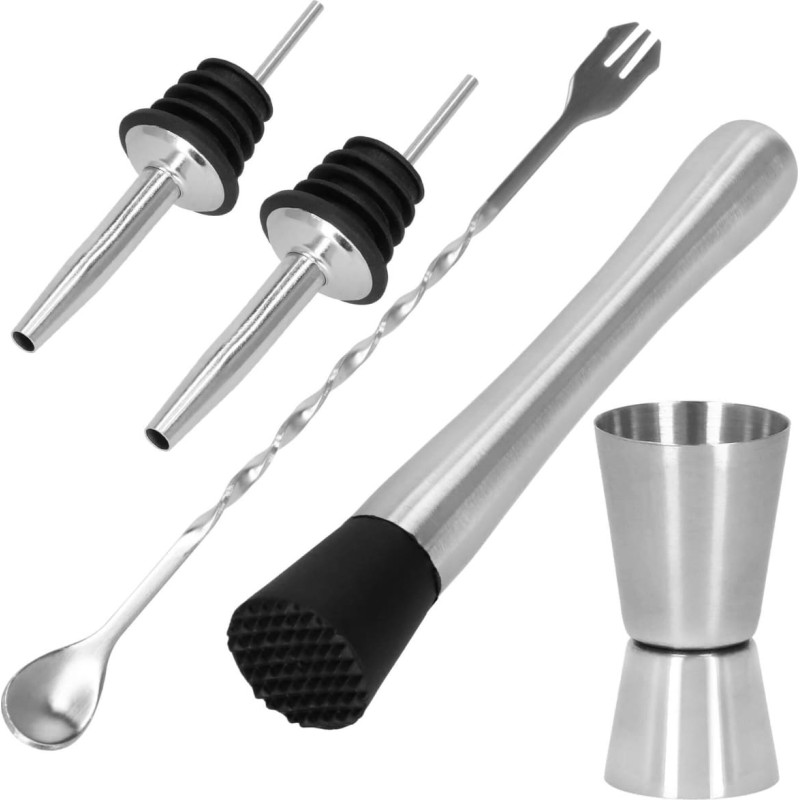 Patvirtintas sąlyčiui su maistu Neutralus skoniu ir kvapu Puiki dovanos idėja bet kokiai progai Kiekvienas elementas pagamintas iš patvaraus nerūdijančio plieno Visas komplekto dalis galima plauti indaplovėje Medžiaga; Nerūdijantis plienas Spalva: sidabrinė Elementų skaičius: 8 Pakuotės matmenys: plotis: 11,5 cm, ilgis: 9,5 cm, aukštis: 27 cm 550 ml talpos Į komplektą įeina: 1 x purtytuvas (trijų dalių) - aukštis: 21 cm / įėjimo skersmuo: 8,5 cm / puodelio pagrindo skersmuo: 5,5 cm 1 x jigger - aukštis: 6,5 cm, skersmuo: 4 cm ir 3,5 cm 1 x barmeno filtras - ilgis: 18 cm, plotis: 9 cm 1 x tinklinis filtras - ilgis: 22 cm 2 x filtras - ilgis: 11 cm 1 x kvailys - 21 cm 1 x barmeno šaukštas - ilgis: 26 cm 1 x barmeno filtras – ilgis: 1 x akių filtras – ilgis: