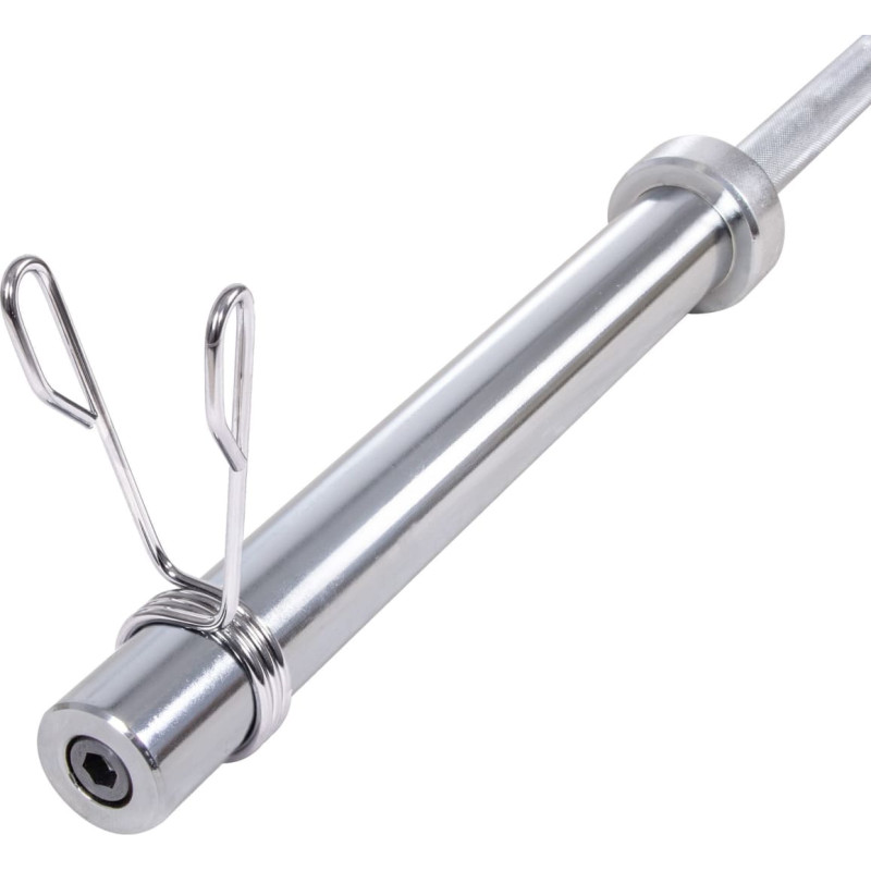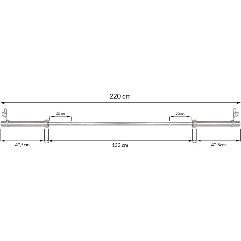 Parametrai: Visas ilgis: 220 cm Suėmimo dalies ilgis: 4x 20 cm Svorio dalies ilgis: 2x 41,5 cm Svorio dalies skersmuo: 50 mm Maksimali apkrova: 200 kg Svoris: 20 kg Į komplektą įeina: Olimpinė juosta 220 cm 2x spaustukai