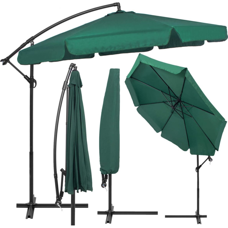 Pagrindinė informacija: Prekinis ženklas: Springos® Medžiaga: plienas, poliesteris Baldakimo spalva: žalia Konstrukcija: 8 plokštės Rėmo spalva: juoda, dažyta milteliniu būdu Mechanizmas: švaistiklis Komplekte dangtelis Matmenys: Skėčio ilgis: 290 cm Skėčio medžiagos plotis (su raukiniais): 350 cm Skėčio medžiagos plotis (be raukinių): 300 cm Bendras aukštis (išskleidus baldakimą plokščiai): 262 cm Aukštis su sulankstytu stogeliu ir strėlėmis apačioje: 275 cm Aukštis iki konstrukcijos po baldakimu: 218 cm Pagrindo atramos ilgis: 100 cm Ventiliacijos angos skersmuo: 33 cm Apvalkalo skersmuo virš ventiliacijos angos: apytiksl. 42 cm Pagrindinės kojos aukštis: 4 cm Pagrindinės kojos plotis: 10 cm Vienos pagrindo rankos ilgis: 48 cm Strėlės ilgis matuojamas lanku: apytiksl. 200 cm Vertikalus stiebo ilgis: apytiksl. 200 cm 1 skydelio plotis stogelio krašte: 110 cm Raukinio ilgis: 20 cm Raukinio plotis: 107 cm (matuojant per centrą) Uždaro stogelio plotis: apytiksl. 45 cm Uždaros stogelio ilgis: 160 cm Švaistiklio ilgis: 12 cm Rankenos ilgis ties stiebu: 12 cm Stiebo vamzdžio skersmuo: 48 mm Strėlės vamzdžio skersmuo: 42 mm Baldakimo vamzdžio profilis: 14x18 mm Baldakimą vainikuojančio vamzdžio skersmuo (po ventiliacijos anga): 30 mm Vamzdžio/konstrukcijos ilgis po baldakimu: 28 cm Viršelio matmenys: 167 x 47 x 47 cm Papildoma informacija: Lengvai ir greitai sulankstomas ir išskleidžiamas Neperšlampama medžiaga: taip Paprastas ir lengvas surinkimas ir išmontavimas Skėčio stogelio kampo reguliavimas Komplekte nėra apkrovų ar varžtų pagrindo tvirtinimui prie žemės.
