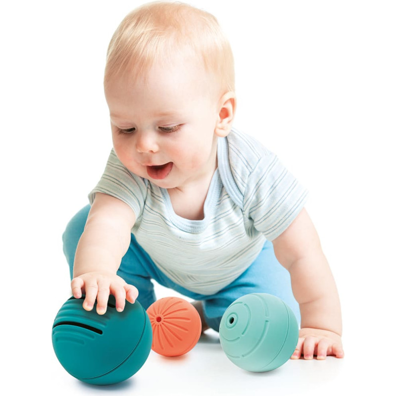 Trys minkšti kamuoliukai, kurie susideda vienas į kito vidų. Kamuoliukai pritaikyti mažoms rankytėms. Kamuoliukų paviršius leidžia susipažinti su naujomis tekstūromis, lavinti lytėjimo juslę ir judesių koordinaciją Puiki pramoga mažylių maudynėms - smagu stebėti pro skirtingų dydžių kamuoliukų skylutes tekantį vandenį. Pagaminti iš 100% silikono. Rekomenduojama vaikams nuo 6 mėn. Kamuoliukų išmatavimai Ø 8,4 cm, Ø 6,9 cm Ø 5,3 cm. Pakuotės išmatavimai 11.50x26.70x8.60 cm. Žaislas paženklintas CE ženklu. Pagaminta Kinijoje specialiu SAS JBM, Ludi, Prancūzija, užsakymu.