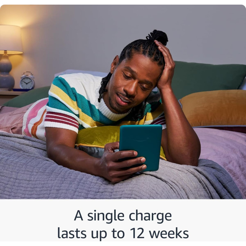 Mūsų visų laikų greičiausias „Kindle“ – naujos kartos 7 colių „Paperwhite“ ekranas pasižymi didesniu kontrasto santykiu ir 25 % greitesniu puslapių vartymu. Paruošta kelionei – itin plonas dizainas turi didesnį ekraną be akinimo, todėl puslapiai išlieka ryškūs, kad ir kur būtumėte. Pabėkite į knygas – jūsų „Kindle“ neturi socialinės žiniasklaidos, pranešimų ar kitų dėmesį blaškančių programų. Ilgiausio romano akumuliatoriaus veikimo laikas – vienas įkrovimas per USB-C veikia iki 12 savaičių. Skaitykite esant bet kokiam apšvietimui – nustatykite ekraną nuo balto iki gintaro, kad galėtumėte skaityti ryškioje saulės šviesoje arba tamsoje. Atsparus vandeniui ir be rūpesčių – mėgaukitės savo pasakojimais prie baseino, vonioje ar bet kur tarp jų. Didžiulis pasirinkimas – Akimirksniu pasiekite daugiau nei 15 milijonų pavadinimų Kindle parduotuvėje visame pasaulyje ir pridėkite Kindle Unlimited prenumeratą, kad galėtumėte skaityti visapusiškai prieigą prie katalogo, kuriame yra geriausiai parduodamų knygų.