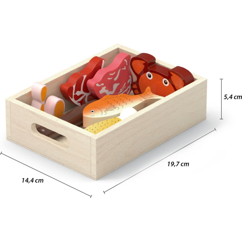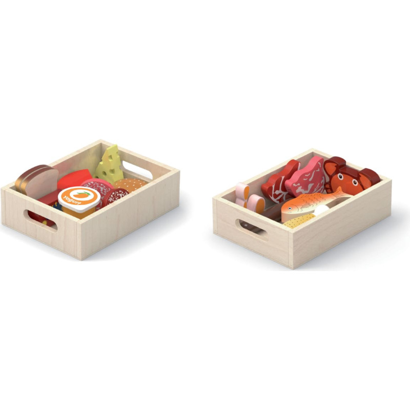 Viga Drewniany Zestaw Artykułów Spożywczych w Skrzynkach Śniadanie Ryby Mięso Nabiał