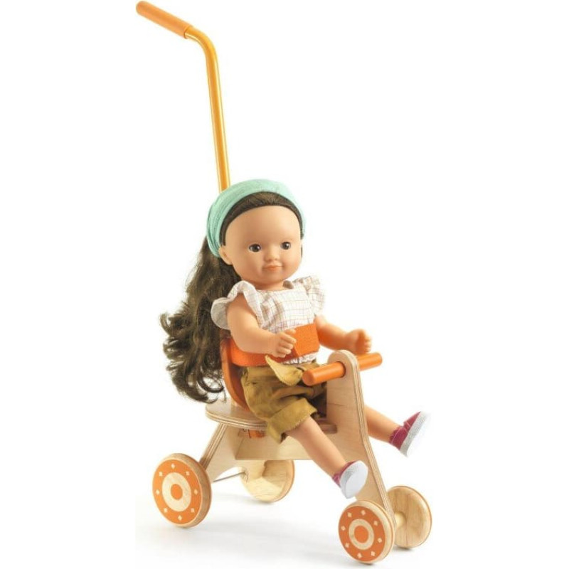Mini lėlės dydžio triratis. Pasodinkite lėlę ant triračio sėdynės, pritvirtinkite ją dirželiu ir galite eiti pasivaikščioti į sodą ar miegamąjį. Komplekte yra 1 medinis triratis (52 x 27.5 x 14.5 cm) su metaline rankena ir reguliuojamu Velcro© saugos dirželiu. Tinka lėlėms nuo 30 iki 36 cm. Rekomenduojamas amžius: nuo 2 metų. Kilmės šalis: K.L.R. Pagaminta pagal Prancūzijos dizainą ir užsakymą.