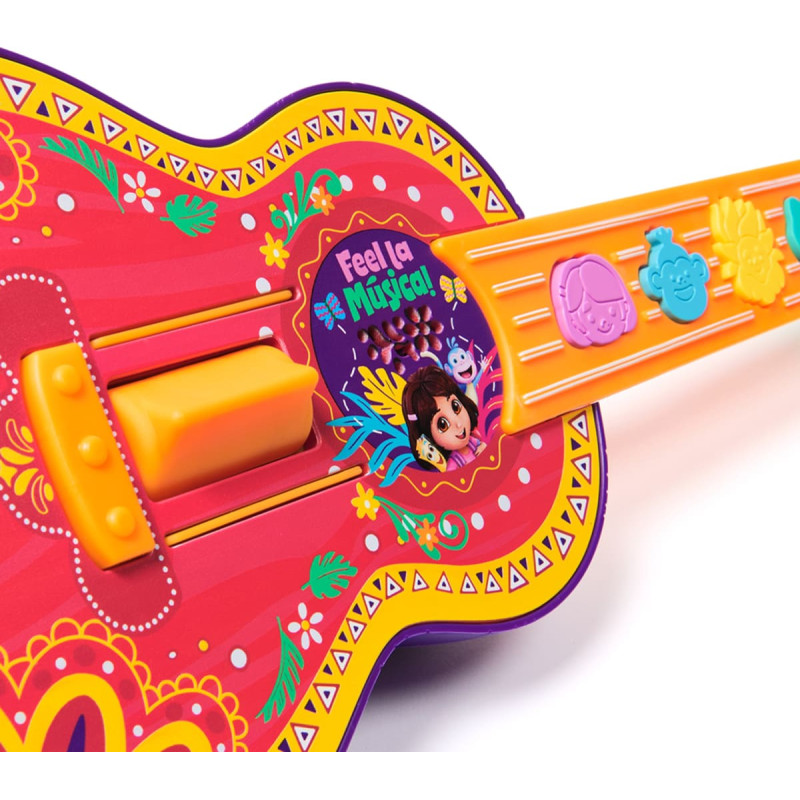 Pasinerk į muzikos ir nuotykių pasaulį su Dora Jam & Play Charango! Ši spalvinga žaislinė gitara atrodo lygiai kaip ta, kuria Dora groja laidoje. Įkvėptas Pietų Amerikos instrumento, šis įdomus vaikų muzikos žaislas leidžia mažiesiems tapti muzikantais kaip Dora. Charango yra 48 cm ilgio, kaip ukulelė, ir turi penkis personažų formos akordų mygtukus bei braukimo juostą, kurios sukuria unikalius garsus, grojamus kartu. Jame taip pat yra specialus žaidimo režimas ir pridedama kolekcinė kortelė. Žaislas yra angliškas arba tik su garsais.