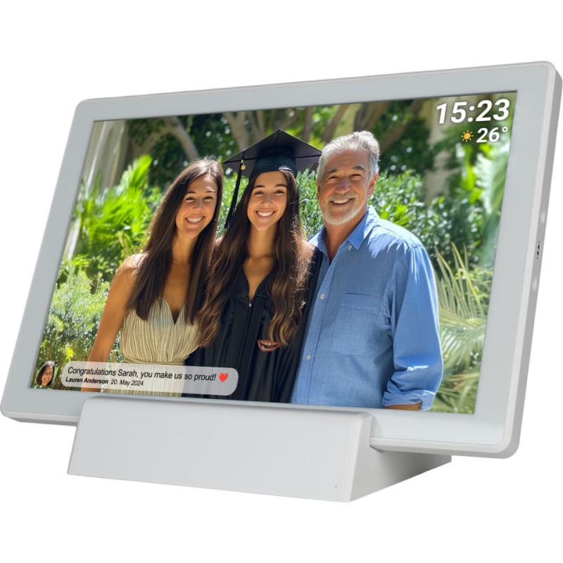 Stulbinantis ekranas ir daug atminties Atgaivinkite savo mėgstamiausius prisiminimus ryškiame 10,1 colio HD IPS jutikliniame ekrane su 1280 × 800 raiška ir 16 GB integruota „flash“ atmintimi.   Patogus ir įkraunamas 3000 mAh baterija užtikrina ilgą rodymo laiką, o pridedamas įkrovimo stovas yra ir stilingas stovas, užtikrinantis paprastą naudojimą. Išimkite jį iš stovo ir peržiūrėkite nuotraukas patogiai sėdėdami.   Socialinės žiniasklaidos integracija su FRAMEO Siųskite nuotraukas ir vaizdo įrašus tiesiai iš savo išmaniojo telefono naudodami iš anksto įdiegtą FRAMEO programėlę – puikiai tinka dalintis akimirkomis su šeima ir draugais realiuoju laiku.   Pritaikoma ir patogu naudoti Pridėkite antraštes, tvarkykite draugus ir valdykite ekrano nustatymus tiesiai iš jutiklinio ekrano. Nustatykite nuotraukų sukimosi intervalus ir naudokite laikmatį, kad išjungtumėte rėmelį naktį.   Patobulinta žiūrėjimo patirtis FRAMEO skaitmeninis nuotraukų rėmelis siūlo sklandų, interaktyvų būdą mėgautis ir dalytis prisiminimais – idealus priedas prie bet kurių modernių namų.