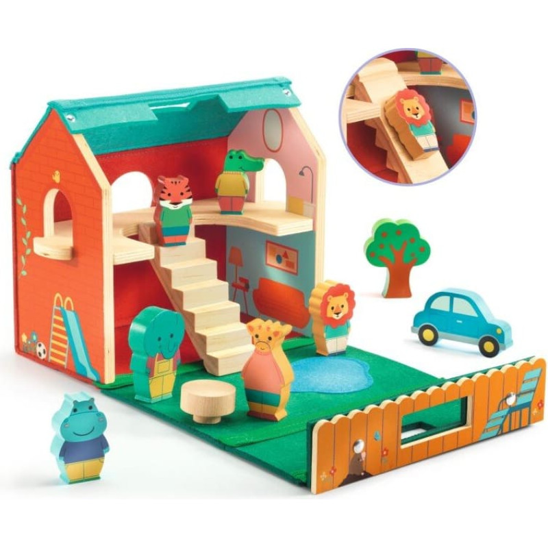 Žaislinis namas, pagamintas iš storos veltinio ir medžio. Žaiskite su figūrėlėmis ir smagiai kurkite istorijas. Baigę žaidimą, sudėkite visas dalis į namą ir patogiai neškitės jį už rankenėlės. Rinkinyje yra: namas (26 x 23 x 14 cm), laiptai / čiuožykla, 10 įvairių medinių figūrėlių (8 skirtingi gyvūnai, mašina ir staliukas). Dalys yra didelės ir lengvai apčiuopiamos. Imitaciniai žaislai lavina fantaziją, ugdo socialinius bei kalbos įgūdžius. Rekomenduojamas amžius: nuo 18 mėnesių. Kilmės šalis: K.L.R.