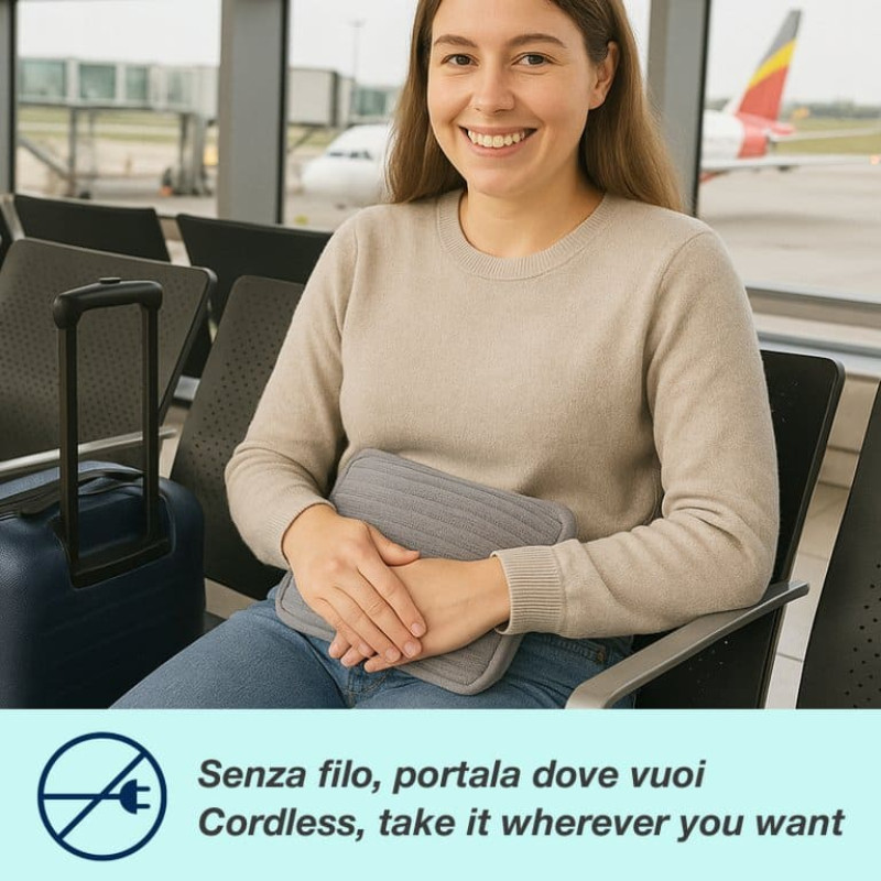 Elektrinis vandens šildytuvas su minkštu poliesterio pamušalu ir patogiomis kišenėmis rankoms. Idealiai tinka šaltomis žiemos dienomis arba norint greitai numalšinti lokalizuotą raumenų skausmą ir įtampą. Patogus ir lengvai naudojamas, maksimalią darbinę temperatūrą (apie 50 °C) pasiekia per mažiau nei 15 minučių ir išlaiko šilumą iki 2 valandų. Saugu naudoti: nereikia pildyti vandens ir įrengta apsaugos nuo perkaitimo sistema.