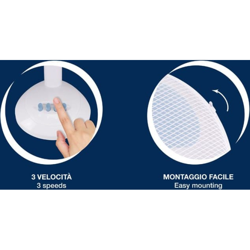 Stalinis ventiliatorius su 3 mentėmis ir plieninėmis apsauginėmis grotelėmis, 30 cm skersmens. 3 pasirenkami greičiai, reguliuojamas vertikalus pasvirimas ir automatinė osciliacijos funkcija. Jį galima pastatyti ant bet kokio pakelto paviršiaus, o apvalus pagrindas garantuoja maksimalų stabilumą.