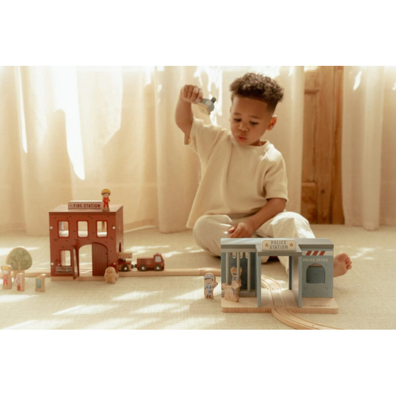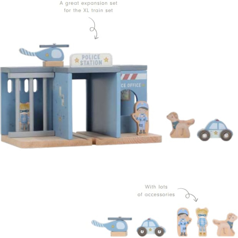 Thief spotted! This wooden police station has everything for exciting police stories. It includes a police car, a helicopter, an officer, a thief, and even a police dog! The station features a jail cell with bars and a landing platform. Lock up the thief and keep the city safe. This police station toy is a perfect addition to the wooden train track XL and encourages imaginative play. Who will you take to the station? Dimensions: 27 x 18,5 x 16,5 cm Material: FSC wood Age: 2+ years