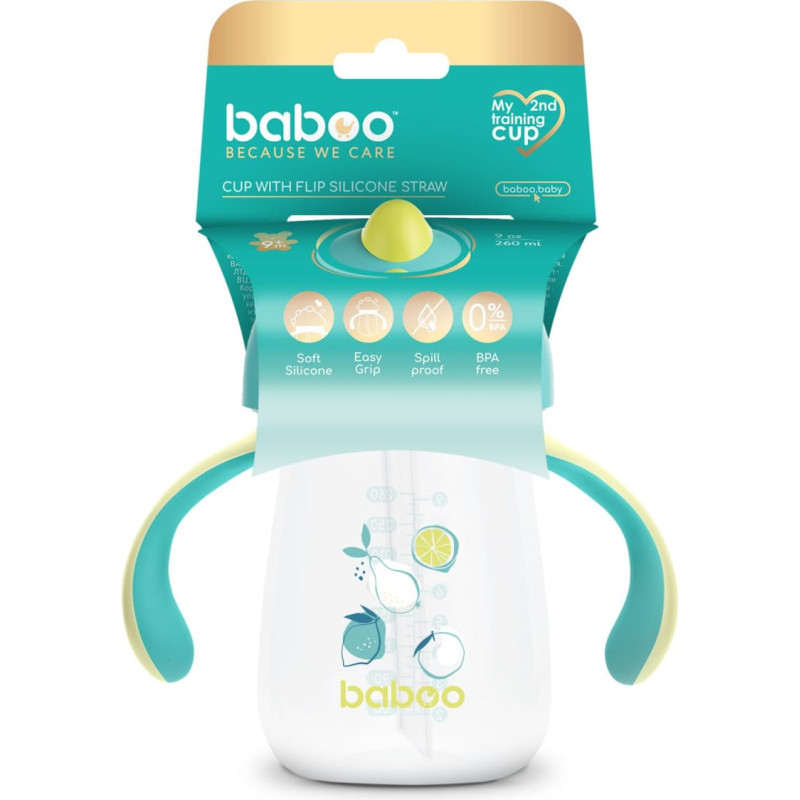 Baboo Non-Spill Cup with Silicone Straw Developed with pediatricians, the Baboo non-spill cup ensures a smooth and comfortable transition to independent drinking. The soft and durable silicone straw protects your child’s sensitive teeth and gums while resisting bites. As your child grows, simply remove the handles and use it like a regular cup. Key Features: • Safe and high-quality material, impact-resistant • Ergonomic removable handles • Capacity: 260 ml • Non-spill silicone straw design • Hinged protective lid for hygiene • Dishwasher safe • BPA-free • Recommended age: 9+ months