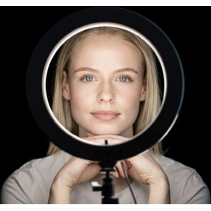 Techninės detalės: -10 colių / 25 cm skersmens žiedinė šviesa -Reguliuojamas spalvų balansas 3500K - 5500K (balta, natūrali, šilta) -Reguliuojamas ryškumas (10% -100%) -Patvarus perlu sidabru padengtas aliuminio lydinio šerdis -120 aukštos kokybės individualūs šviesos diodai -Lengva nustatyti ir valdyti -Tripodas įtrauktas (reguliuojamas aukštis 55cm - 73cm) -USB kištukas 5v / 2a (veikia su maitinimo banku arba USB-AC kištuku) -Suderinamas su visais išmaniaisiais telefonais ir „Action“ kameromis -Suderinamas su DSLR fotoaparatais (didžiausias rekomenduojamas bendras svoris 2kg / 4lb) -Įtrauktas „Bluetooth“ užraktas -Nešimo dėžutė įtraukta Į paketą įeina: 10 colių žiedinis žibintas, trikojis, „Bluetooth“ užraktas, universalus išmaniojo telefono spaustukas, DSLR ir veiksmo kamera tvirtinimo adapteris su ¼ colio sriegiu, vartotojo vadovas, dėklas, šviesos valdiklis, USB kištukas   Pakuotės svoris: 2,2 kg Pakuotės matmenys: 85 x 314 x 322 mm