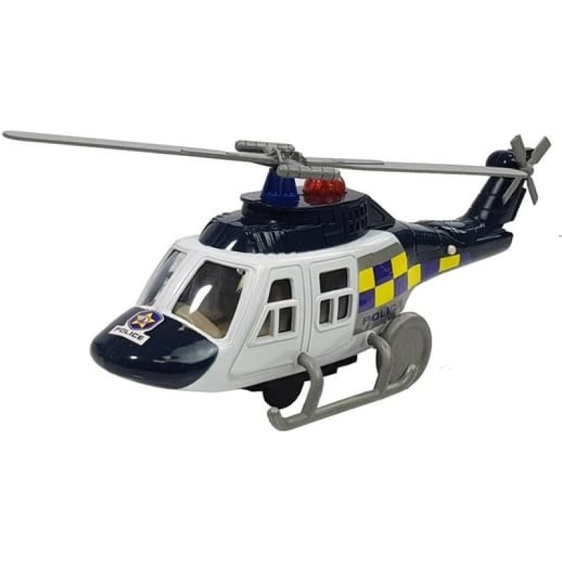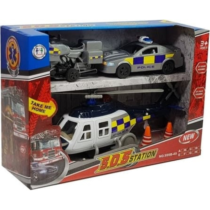 Komplektā ietilpst: -Helikopters -Auto -Motocikls -divi konusi. Komplekts izgatavots policijas stilā. Helikopterim ir gaismas un skaņas efekti (baterijas ir iekļautas komplektā), kas vēl vairāk mudina mazuli rotaļāties. Uzmanīgi nospiežot pogu uz helikoptera aizmugurējās daļas, atskan policijas sirēna un iedegas sarkanā gaisma.