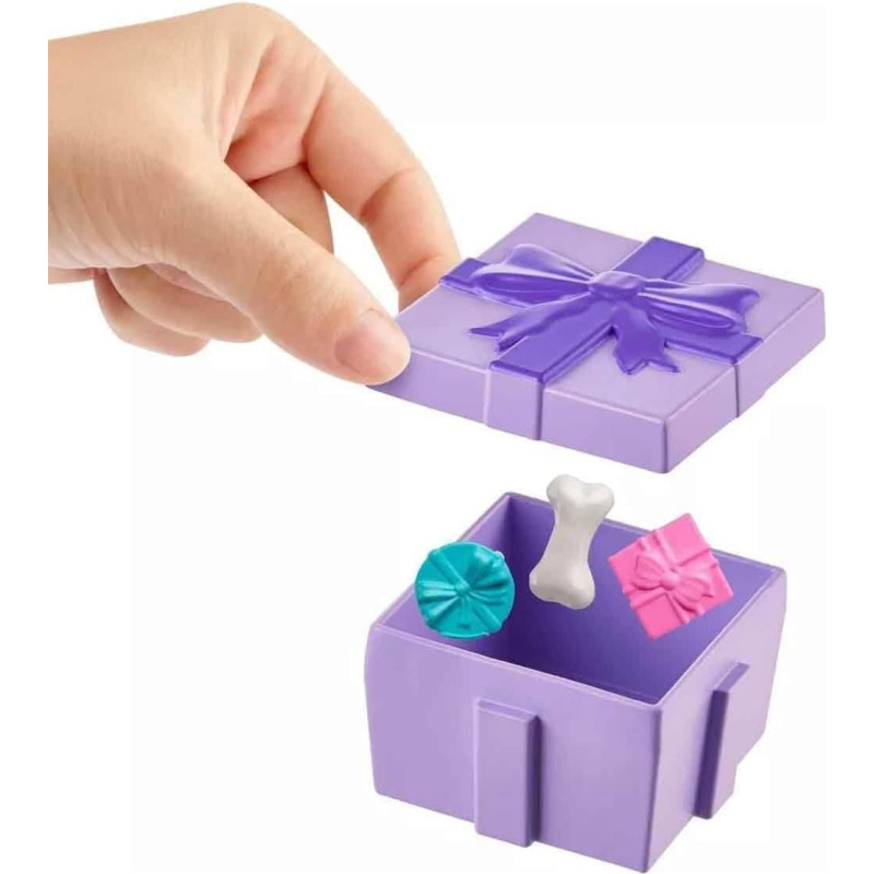 POLLY POCKET Birthday Party Pack 2 DOLLS, PUPPY AND 35 ACCESSORIES. Features a balloon garland with pinata and a large gift box with a surprise piece inside. Suitable for ages 4+.