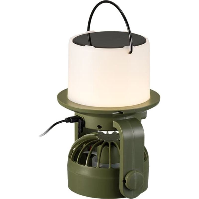 Įkraunama saulės energija Baterijos lygio indikatorius Šviesos srautas: 180 lm 2 ventiliatoriaus režimai: didelis, normalus Įmontuota 1800 mAh baterija Šviesos šaltinis: COB + LED Pakabinimo kabliukas