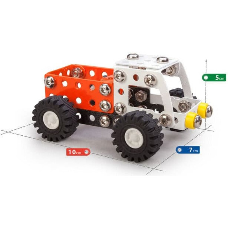 Metalinis konstruktorius, su kuriuo vaikas galės savarankiškai surinkti transporto priemonės modelį. Transporto priemonė sudaryta iš įvairių formų ir dydžių metalinių detalių bei papildomų plastikinių dalių. Šis žaislas padeda lavinti vaiko rankų įgūdžius, erdvinį mąstymą, techninius gebėjimus ir kantrybę. Rinkinyje yra visos reikalingos metalinės detalės, įrankiai ir surinkimo instrukcija. Tinka vaikams nuo 8 metų amžiaus. Įspėjimas! Netinka vaikams iki 3 metų – užspringimo pavojus dėl smulkių detalių. Pagaminta Lenkijoje.