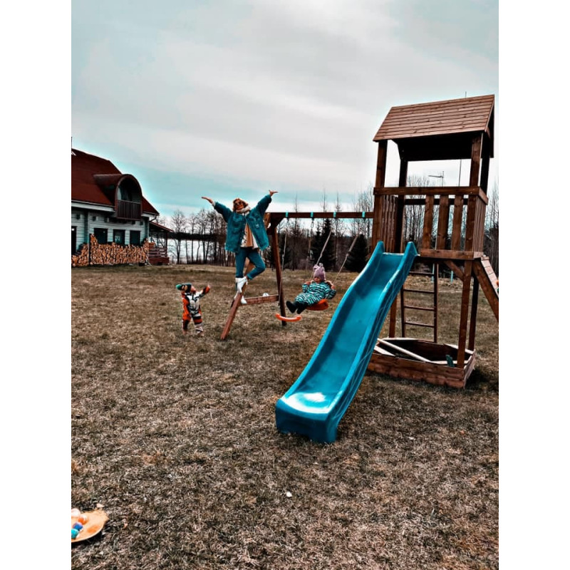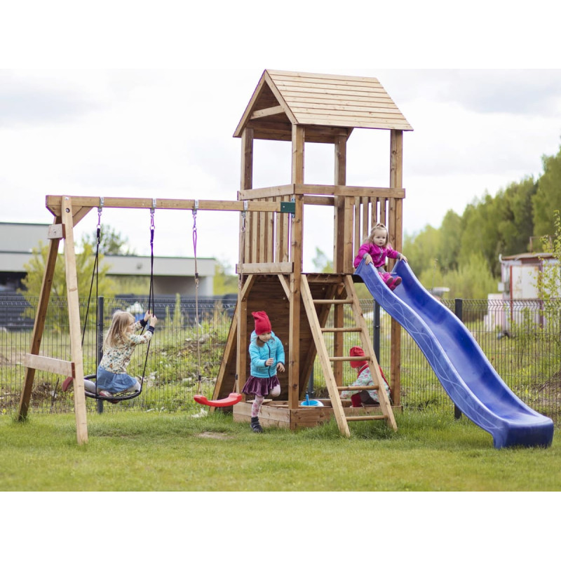 Bērnu rotaļlaukums “Rudzi” – atmiņā paliekošiem brīžiem jūsu bērniem! Viens no vispopulārākajiem koka rotaļlaukumiem, kurā var spēlēties vairāki bērni vienlaikus. Aktīva laika pavadīšana un izklaide bērniem, kas garantēs smaidus un prieku jūsu pagalmā. Šajā komplektā neietilpst slidkalniņš. Tāpēc mēs iesakām papildus iegādāties vienu no šiem rotaļlaukumu komplektiem  vai iegādāties 220 cm garu slidkalniņu. Rotaļlaukuma komplektācijā ietilpst: • tornis ar jumtu; • vieta smilšu kastei torņa apakšā; • šūpoļu rāmis (augšējās šķērssijas izmērs: 90 x 90 mm, kāju stabu izmērs 70 x 70 mm); • piekarināmas šūpoles ar stiprinājuma karabīnēm; • salikšanai nepieciešamā instrukcija un skrūves. [gallery link="file" columns="2" size="medium" ids=""] UZMANĪBU!  Rotaļlaukums ir izgatavots no dabiska, neapstrādāta koka un paredzēts izmantošanai ārpus telpām. Šī tipa koksnei ir raksturīgs nelīdzenums un reizēm arī plaisas, zaru mezgli vai neliels raupjums, ko var viegli novērst, nopulējot ar smilšpapīru. Rotaļlaukumiem izmantotie kokmateriāli ir saņemti no sertificētiem piegādātājiem, un tiem ir FSC sertifikācija. Rotaļlaukums ir izgatavots no koksnes, kas impregnēta, izmantojot īpašu tehnoloģiju! Neuztraucieties, ja sākumā koksne ir ārkārtīgi mitra, – tas ir īpašas materiāla impregnēšanas dēļ. Lai nodrošinātu koksnes ilgmūžību un izturīgumu pret visiem āra apstākļiem, mēs visas namiņa daļas piesūcinām īpašās augstspiediena kamerās. Izmantojot šo tehnoloģiju, piesūcinoša viela (kuras sastāvā nav hroma) tiek izsmidzināta ar 7 atmosfēras lielu spiedienu un koksne vairākas stundas mirkst piesūcināšanai izmantotajā vielā, tādēļ šī viela atrodas ne tikai uz koksnes virsmas kā gandrīz visu citu ražotāju izstrādājumiem. Šī modeļa impregnēšanai tiek izmantota brūna piesūcināšanas viela. ŅEMIET VĒRĀ!  Rotaļlaukumi tiek piegādāti nesalikti un nekrāsoti. Ja plānojat uzstādīt rotaļlaukumu zālājā vai uz zemes, mēs iesakām iegādāties īpašus papildu enkurstiprinājumus, ko ievietot zemē un pie kuriem piestiprināt rotaļlaukuma kājas. Metāla enkuru izmantošana nodrošinās rotaļlaukuma stabilitāti. Mēs iesakām šim rotaļlaukumam izmantot 6 šos metāla enkurstiprinājumus. https://www.youtube.com/watch?v=0fkBWVrNFww https://www.youtube.com/watch?v=7vWXIfplAtk