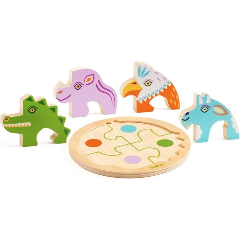 Gyvūnų tematikos medinė dėlionė. Vaikas turi sudėti dėlionės dalis ant pagrindo pagal jų formą ir ant pagrindo pažymėtas linijas. Teisingai sudėtos keturios dalys sudaro apskritimą. Rinkinyje yra: medinė dėlionės pagrindas (skersmuo: 15 cm) ir 4 storos medinės detalės su gyvūnų iliustracijomis. Dėl figūrėlių tūrio ir storio jas lengva suimti mažoms rankytėms. Gyvūnėlius taip pat galima pastatyti vertikaliai ir naudoti kaip žaidimo figūrėles. Rekomenduojamas amžius: nuo 2 metų. Kilmės šalis: K.L.R.