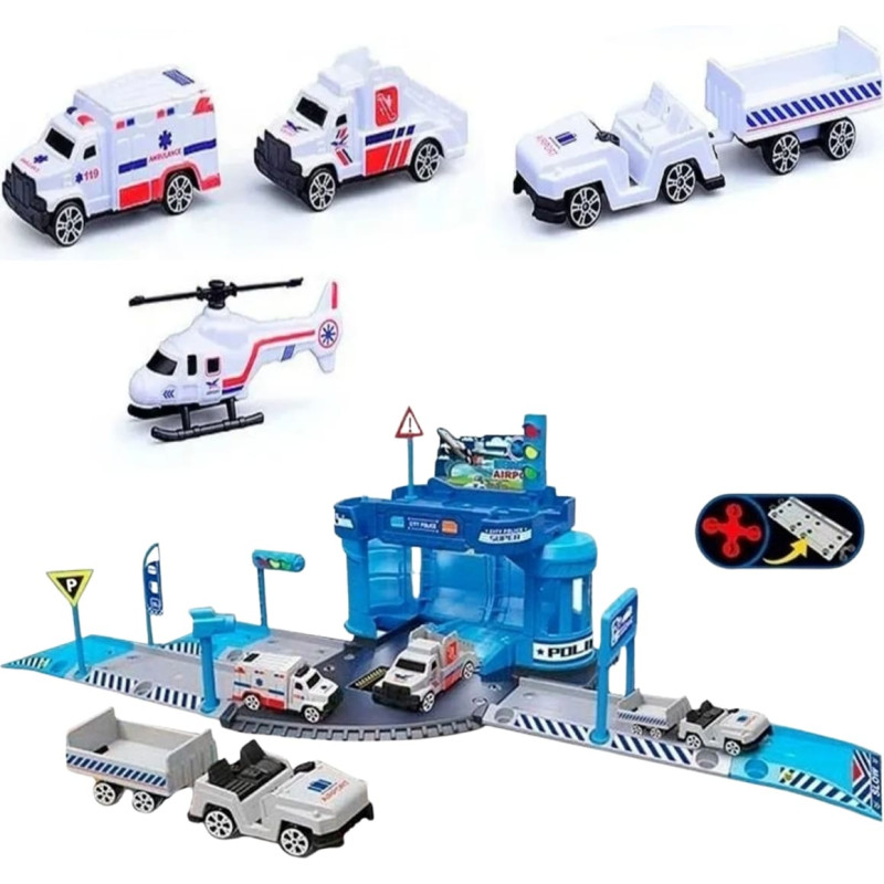 Woopie stovėjimo aikštelės rinkinys su automobiliais ir sraigtasparnio nusileidimo aikštele, 37 detalės